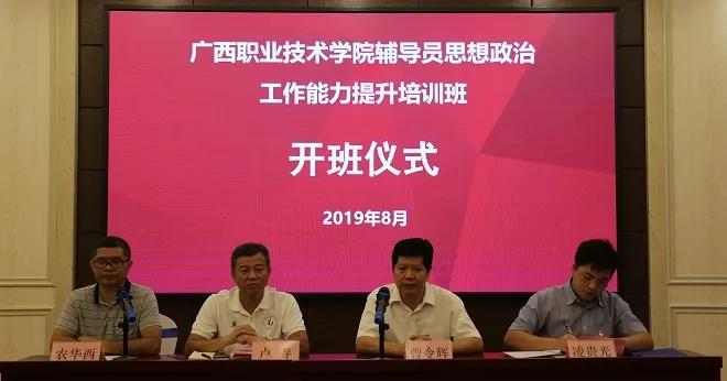 8月21日上午,由广西职业技术学院主办,全国高校辅导员发展研究中心(南宁师范大学)承办的广西职业技术学院辅导员思想政治工作能力提升项目培训班在桂林市兴安县正式开班。广西职业技术学院副院长卢存、南宁师范大学马克思主义学院院长曾令辉教授出席开班仪式。来自广西职业技术学院的辅导员、学生工作部(处)工作人员共47名学员参加本次培训班。