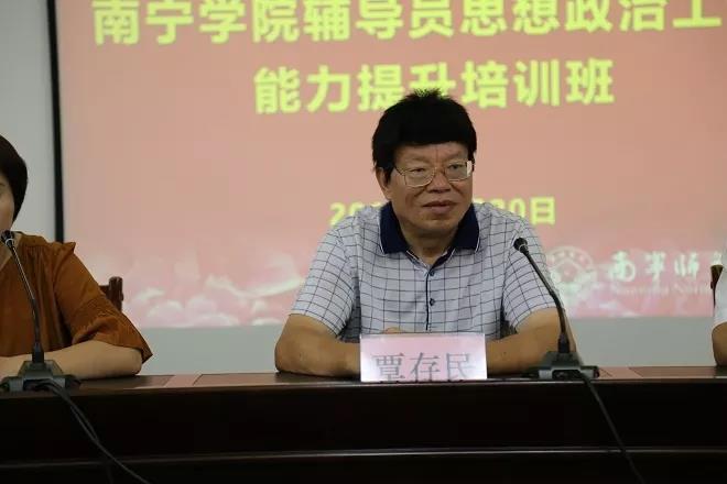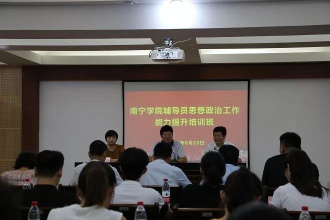 2019年 8月20日,由南宁学院主办,全国高校辅导员发展研究中心(南宁师范大学)承办的南宁学院辅导员思想政治工作能力提升项目培训班在我校明秀校区鸿远楼409室开班。南宁学院党委副书记、纪委书记覃存民,南宁师范大学马克思主义学院院长曾令辉,南宁师范大学马克思主义学院副院长石丽琴,以及来自南宁学院的辅导员、学生工作部(处)38人参加了开班仪式。开班仪式由石丽琴副院长主持。