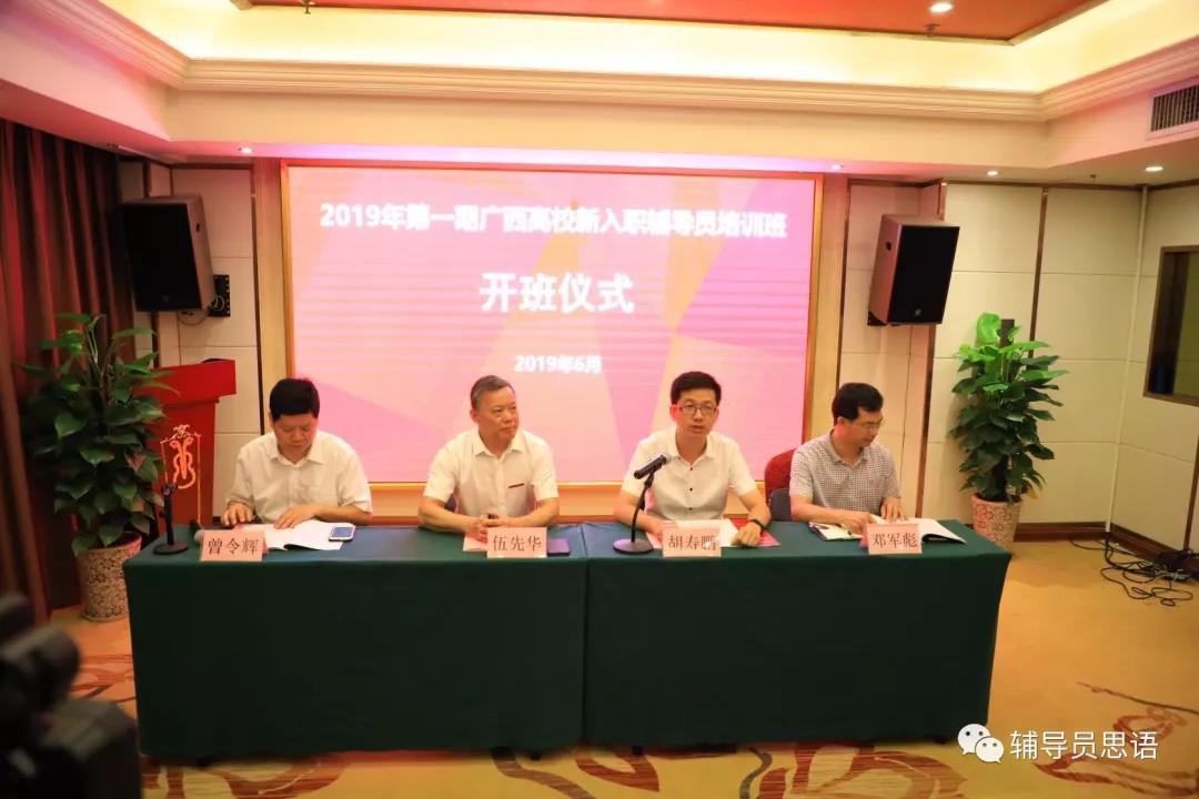 2019年6月13日,由自治区党委教育工委、自治区教育厅主办、高校思想政治工作队伍培训研修中心(南宁师范大学)承办的2019年广西高校新入职辅导员培训班在南宁维也纳国际酒店5楼大会议室举行开班仪式。广西壮族自治区党委教育工委宣传部副部长、自治区教育厅思政处副处长胡寿鹏,南宁师范大学党委副书记伍先华出席了本次活动。活动由马克思主义学院院长曾令辉主持。