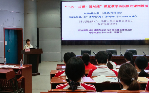 在同题异构专题课例展示环节中,各学段教师立足育人目标,以创新实践诠释思政教育的时代使命。其中,西乡塘区“一心·三研·五对接”思政课堂教学衔接模式成为小学与初中学段教学改革创新的示范。南宁市秀田小学张婷老师以小学道德与法治五年级上册《中华民族一家亲》为载体,紧扣“一心”(以课标为核心),深入开展教材、学情、教情“三研”,通过“民族文化猜猜乐”趣味游戏导入,将校园生活中的民族交往故事、传统节日习俗等鲜活案例融入课堂,生动展现小学阶段“情感浸润式”思政教育特色。南宁市第三十一中学黎观连老师在九年级《促进民族团结》说课中,以“一心·三研·五对接”模式为纲领,将课标要求转化为“认同—理解—践行”三维目标,以“壮美广西绘就民族团结新画卷”为主议题,通过政策解读、案例剖析与思辨讨论,引导学生系统把握民族区域自治制度的优越性,实现从感性认知到理性建构的跃升,为后续学段学习筑牢理论根基。