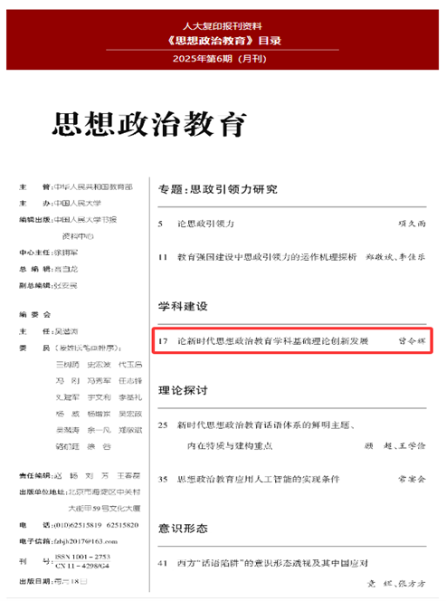 日前,我院曾令辉教授撰写的学术论文《论新时代思想政治教育学科基础理论创新发展》被权威学术转载刊物《人大复印报刊资料·思想政治教育》2025年第6期全文转载。该论文的转载充分彰显了我院在思想政治教育学科基础理论研究领域的前沿水平,是学科建设与学术研究成果获得学界高度认可的重要标志。