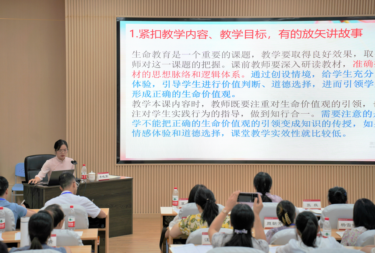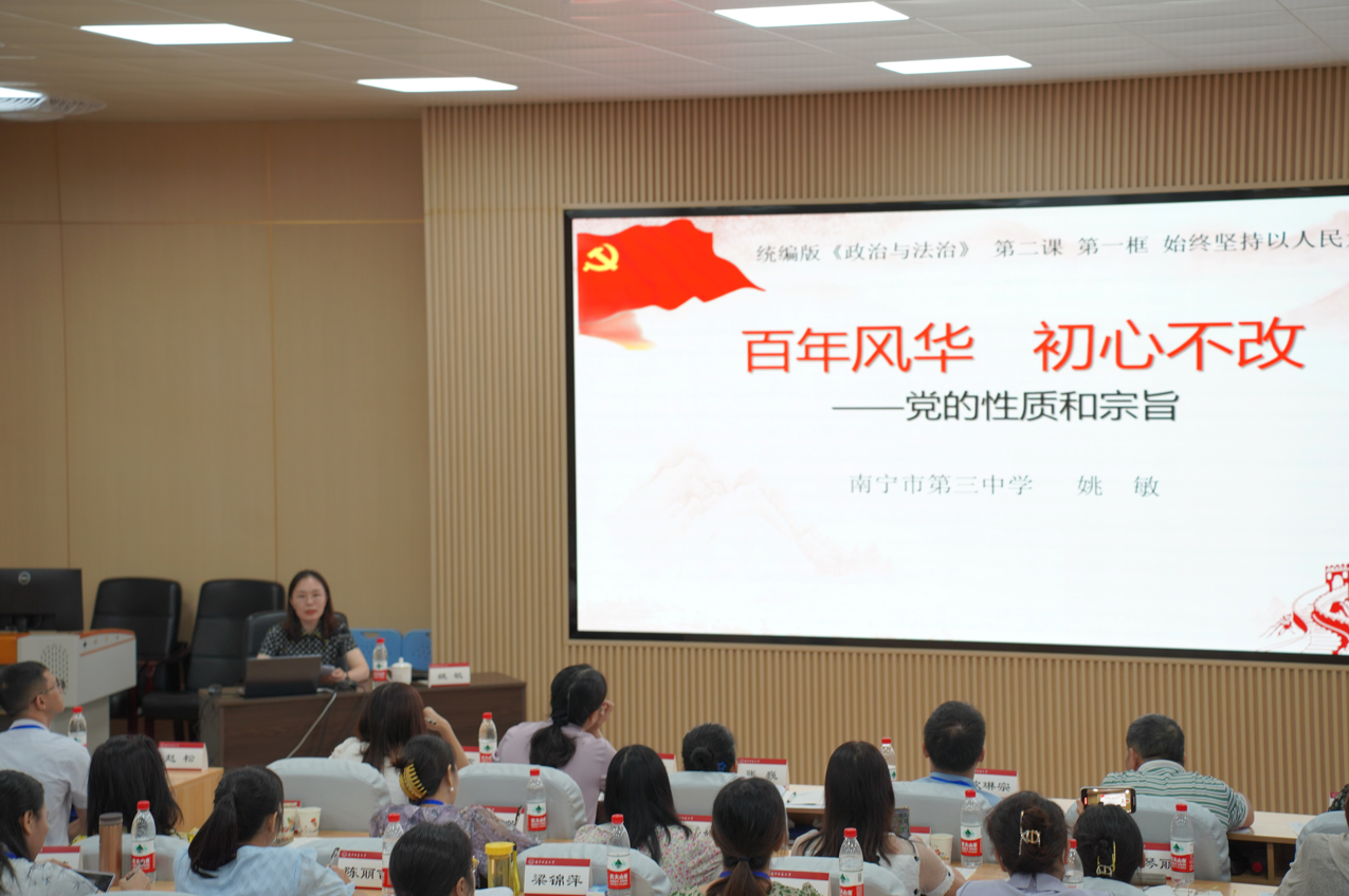 高级教师、南宁市第三中学政治教研组长姚敏老师作了题为“百年风华初心不改——党的性质和宗旨”的教学经验分享。姚老师从“信物——薪火相传”“信念——坚如磐石”“信心——强国有我”三个维度开展了教学视频展示,并从整体思路、教学环节、素材选取等方面,介绍了打造一堂形神具备、立德树人精彩思政课的教学经验。