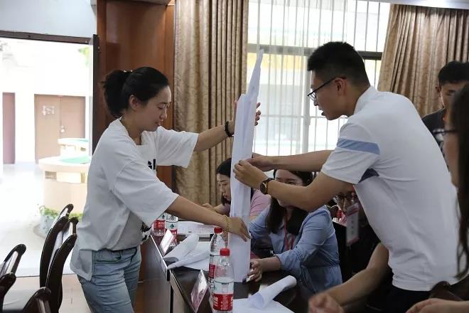 曾教授在本次报告中,采用合作探究法作为专题报告的导入。曾教授带领学员们做“制作宝塔”的游戏,即小组在规定的6分钟内合作完成用10张纸制作宝塔的小组任务,让学员们在游戏中领悟深刻的道理。宝塔制作能否成功,取决于小组内部是否能形成共识,是否有专业的理论和专业的方法;不同的制作思维、理念和方法就有不同的宝塔。曾教授由此引出新时代辅导员育好人,需要有好的理念、理论和思路,要有科学的育人方法,更需要有专业的合作沟通素养。曾教授特别强调,只有具备扎实的专业理论、科学的方法和辅导员核心素养,才能育好人。